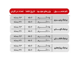 در اندازه های 60 گرمی و به صورت بسته بندی شده در کارتن هایی با ظرفیت 36 بسته قرار میگیرد.